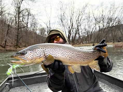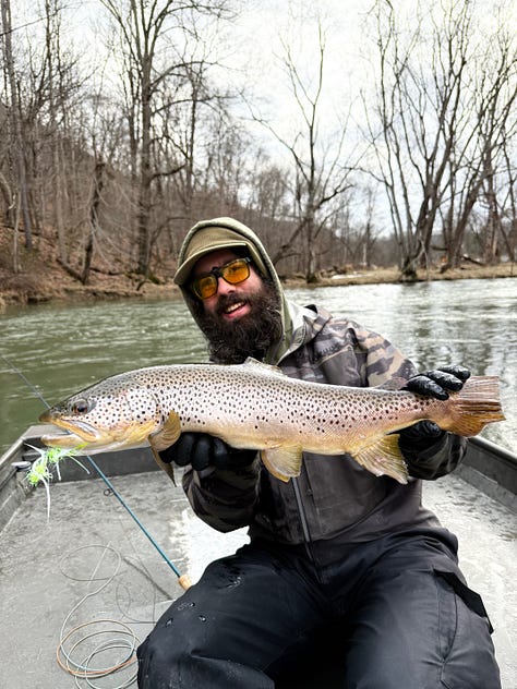 This fish measured 25 ½ “ long and I think it would have scratched 26” if we had taken our time and pinched the tail. It was a big buck with a big head and a big mouth and big shoulders. It wasn’t particularly fat or tall but it certainly wasn’t skinny, either. While this river doesn’t grow the biggest brown trout in the world and it’s not great for numbers, we’ve seen pictures of a few browns pushing 30” here and one day it’s going to happen for us on the fly. We just need to keep fishing.